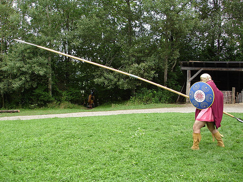 The hoplon stretched from the hoplite’s shoulders to his knees. The rest of his body was protected by a helmet, which covered the face, and a set of greaves to protect his legs. His torso was protected by a cuirass. Most commonly this was made out of treated layers of linen and called a linothorax. It is difficult to know much about the linothorax, as no examples have survived. Linen could make effective armor, but it is more biodegradable than metal. We only know of it through writings and artwork. Some historians have made efforts to construct the armor themselves.
