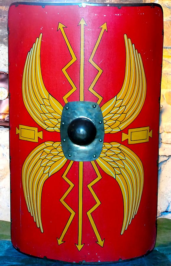 Like many other ancient armies, the Romans placed much emphasis on their shields. The Roman shield, called a scutum, was a convex wooden rectangle with a large metal boss in the center. It was constructed out of three overlapping layers of wood and lined with leather and canvas. The scutum was about 42 inches tall and 16 inches across, covering most of the soldier’s body. It weighed up to 22 pounds, making it an effective weapon in its own right when used to bash the enemy. The legions made heavy use of group formations with their scutum, including shield walls and the famous Testudo. Taking its name from the Latin word for “Tortoise,” the Testudo had the legionnaires forming a wall on the front and sides of the unit with their shields while the soldiers on the inside formed a roof. This formation was virtually impenetrable to arrows and javelins.