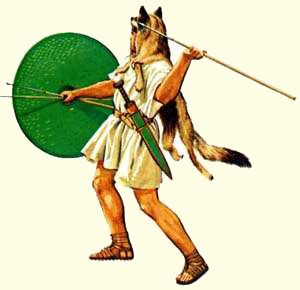 The Roman army also employed skirmishers called Velites. These were the poorest, and typically the youngest, members of the legion. They were armed with about seven light javelins known as veruta, singular verutum. These javelins were three feet long and about the width of a man’s finger. They would throw their veruta at the approaching enemy and then run behind the Roman lines. They carried a small sword as an emergency weapon, in case they found themselves in close-quarters combat. They had very little in the way of armor. They wore distinctive wolf fur headdresses which served more for identification than protection. The only true protection they had was a small circular shield. They relied mainly on their speed to keep themselves out of harm’s way.