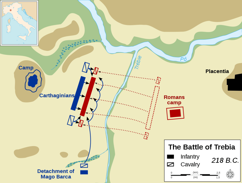 The first major engagement of the war was the Battle of the Trebia. Both of Rome’s Consuls combined their armies into a force of roughly 40,000 men and camped on the side of the Trebia River, across from Hannibal’s army. One of the Consuls, Publius Cornelius Scipio, was wounded from an earlier skirmish with Hannibal’s forces. He only avoided death because he was saved by his sixteen-year-old son, who shared his father’s name. As a result of Scipio’s wounds, overall command was given to the other Consul, Tiberius Sempronius Longus.